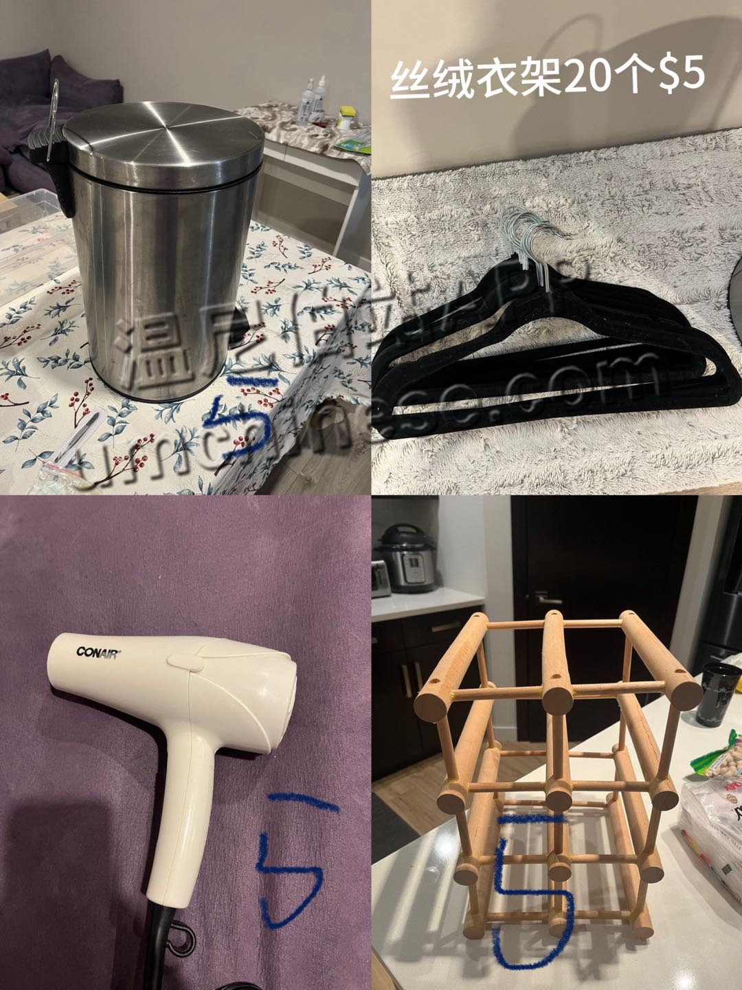 垃圾桶高40cm$5 丝绒衣架20个$5 吹风机$5 红酒架子$5