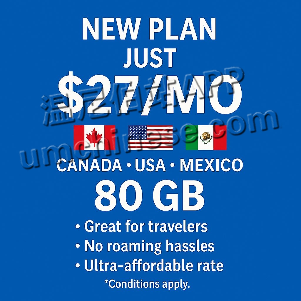周末三天快闪手机计划,美加墨无漫游计划含国际长途27国家,$27-80gb,5G网络没合约!要的小伙伴请加微信rgrxzl或电联204-872-8888