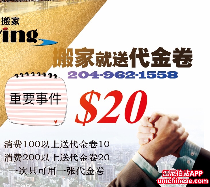 友人搬家13周年庆活动,推出---$代金劵$ 任何用车服务送$5 代金劵 消费100以上送代金劵$10 消费200以上送代金劵$20 本公司承诺,代金劵永久有效,并可以转赠。 204-9621558 或添加微信Ricky_awesomeboy,下边二维码添加 |