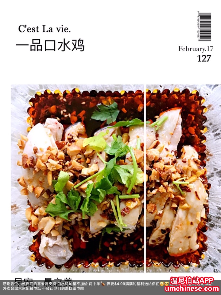 一品厨房全新推出小吃:一品口水鸡[色][色] 只要$4.99!! 全新的十几道工序制成的美味不仅让你看着流口水 吃着也停不下来哦[色][色] 微信号:yipinkitchen1 感谢大家的关注与支持!